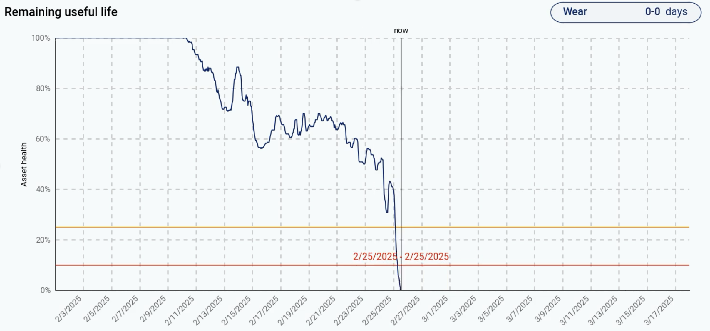 As shown in the above figures, the early RUL estimate suggests that the gear is likely to reach a critical wear threshold in 5-10 days. Armed with this insight, the operations team temporarily reduces load on the unit to extend the life, as visible in the health level plateauing, while procurement secures replacement parts. The fault progresses into a failure at the projected timeline, demonstrating the accuracy of the prognosis.